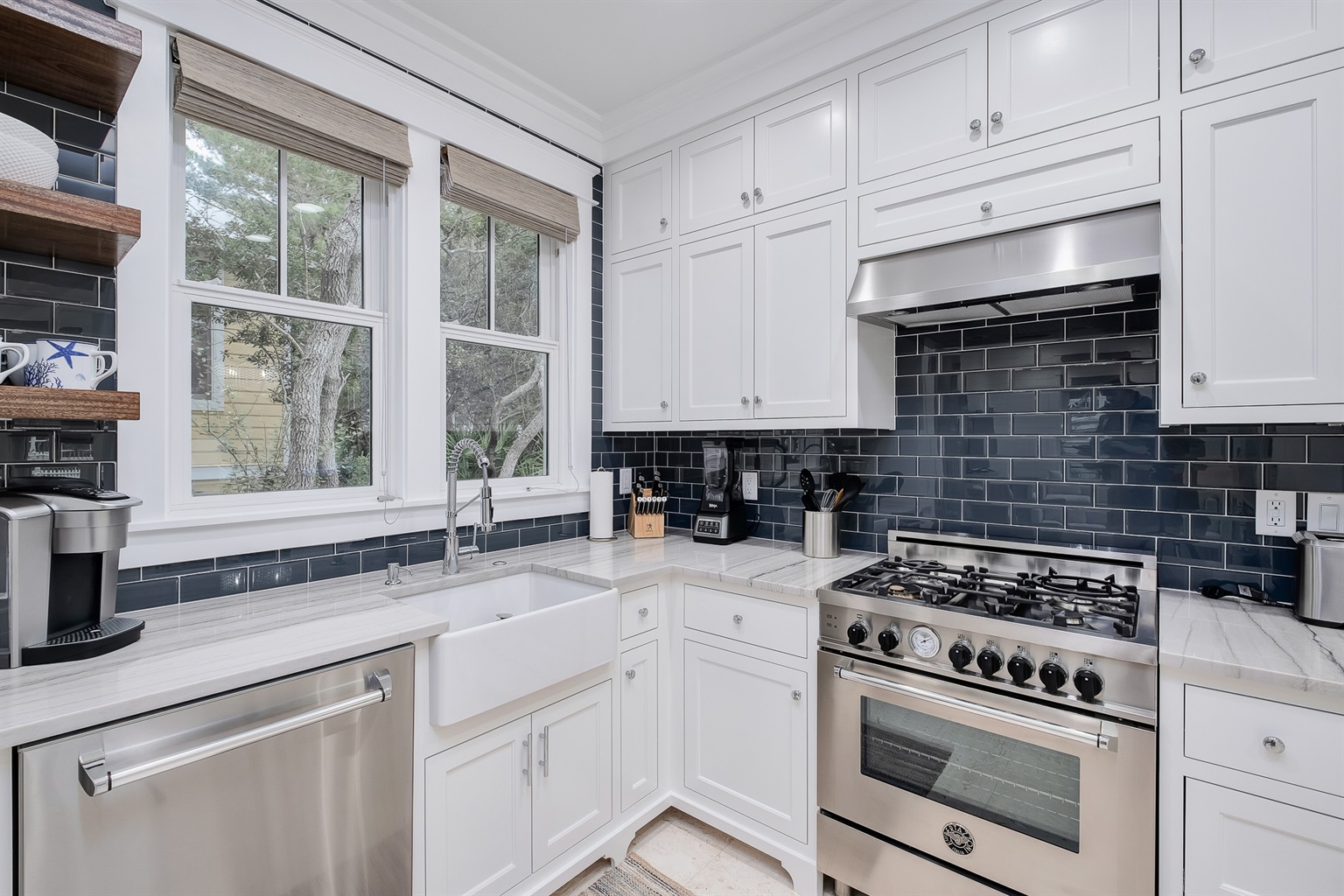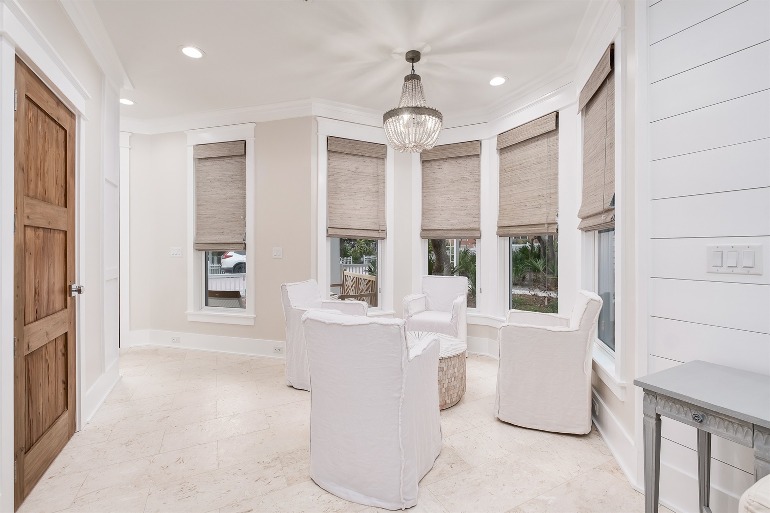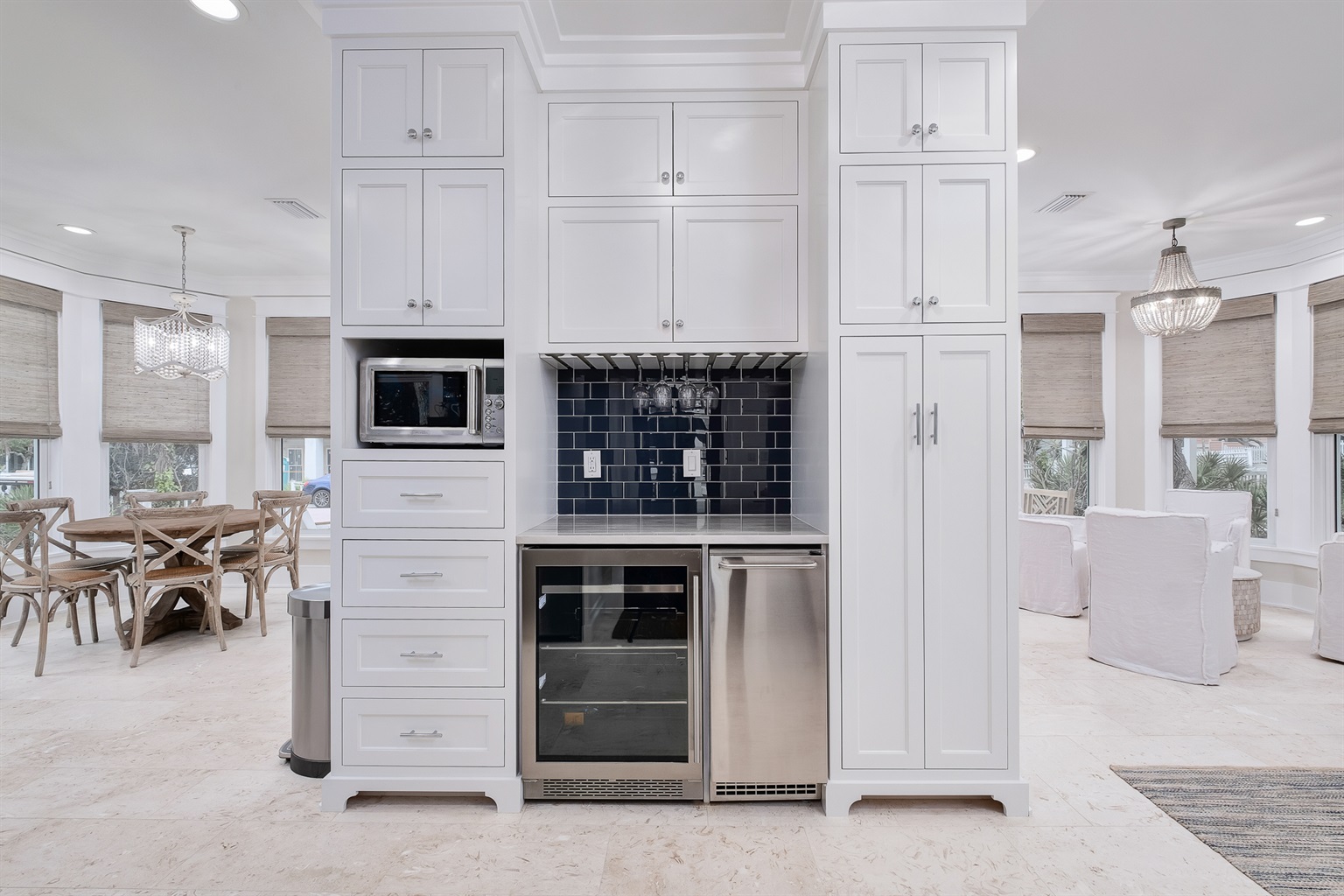 The spacious 1st floor porch welcomes you with ample seating for 6. Once you enter the 1st floor of the house, it features a living/lounging area with 55" QLED TV and speakers to enhance the sound. The living area seats 7. You will also find a bar area with beverage/wine refrigerator and ice maker to easily fill up your cooler to head to the beach. The kitchen is equipped with high end stainless steel appliances including a large Liebherr refrigerator/freezer, Bertazonni gas range, dishwasher, and exhaust hood for those that want to cook in style. A microwave and a fully stocked kitchen allows the guest to relax and enjoy without worry. The dining area seats 6 people. This is a professionally designed and decorated home with ALL brand new COASTAL furniture.