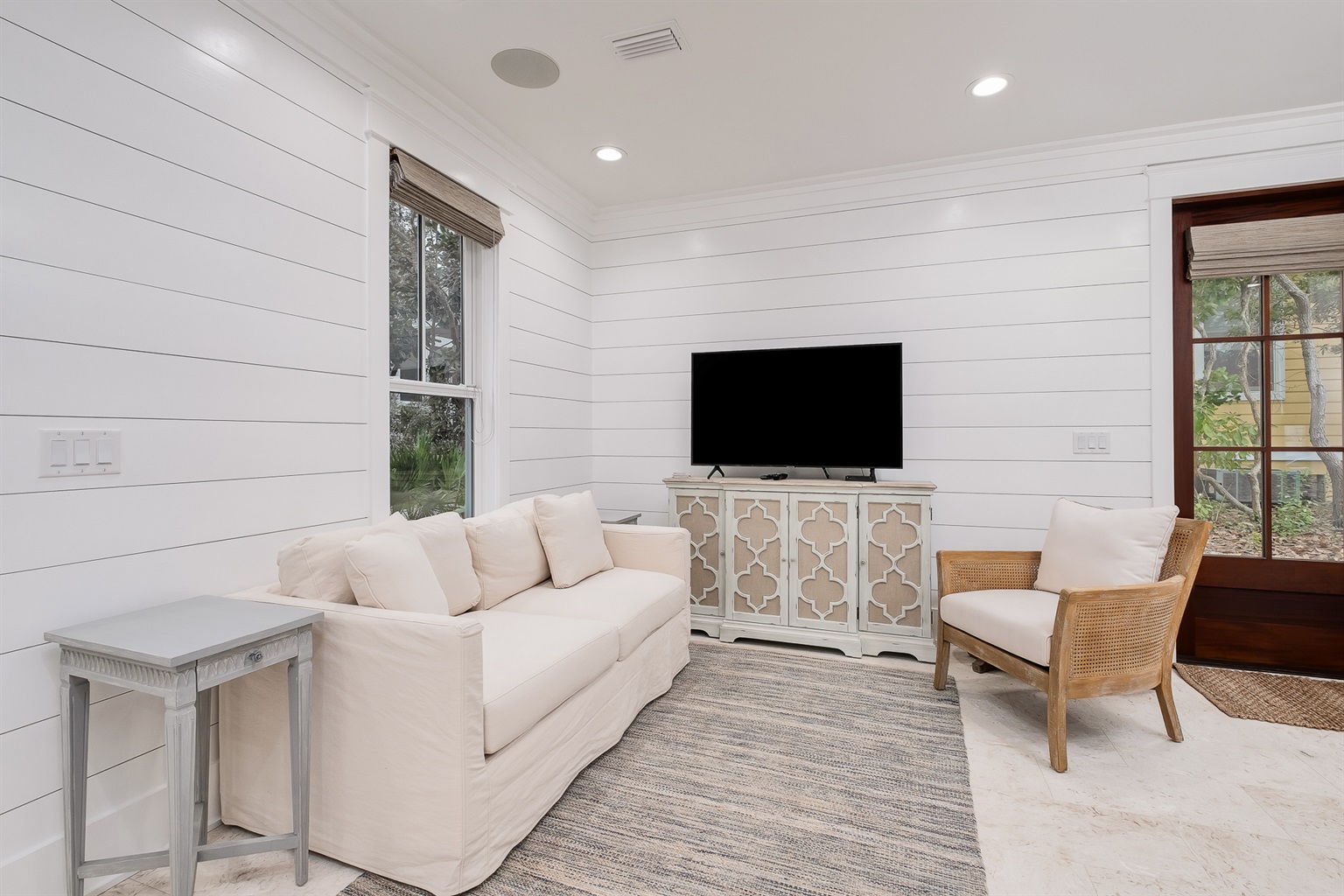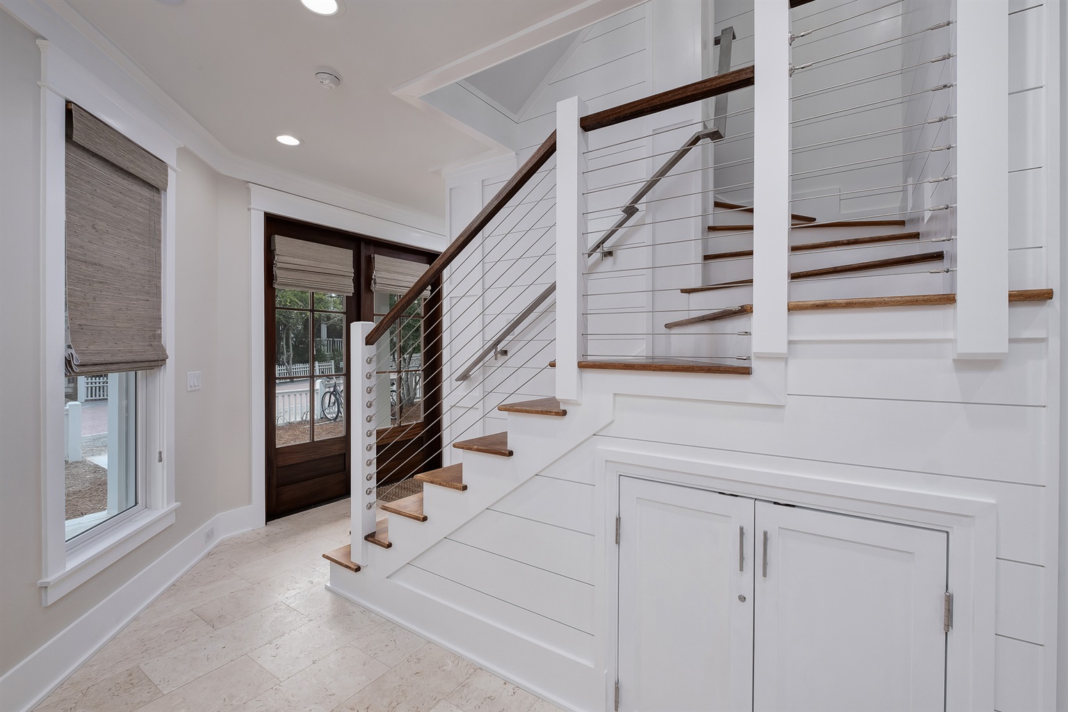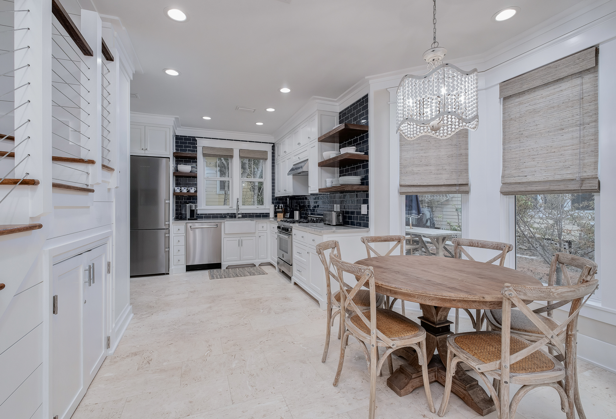 The spacious 1st floor porch welcomes you with ample seating for 6. Once you enter the 1st floor of the house, it features a living/lounging area with 55" QLED TV and speakers to enhance the sound. The living area seats 7. You will also find a bar area with beverage/wine refrigerator and ice maker to easily fill up your cooler to head to the beach. The kitchen is equipped with high end stainless steel appliances including a large Liebherr refrigerator/freezer, Bertazonni gas range, dishwasher, and exhaust hood for those that want to cook in style. A microwave and a fully stocked kitchen allows the guest to relax and enjoy without worry. The dining area seats 6 people. This is a professionally designed and decorated home with ALL brand new COASTAL furniture.