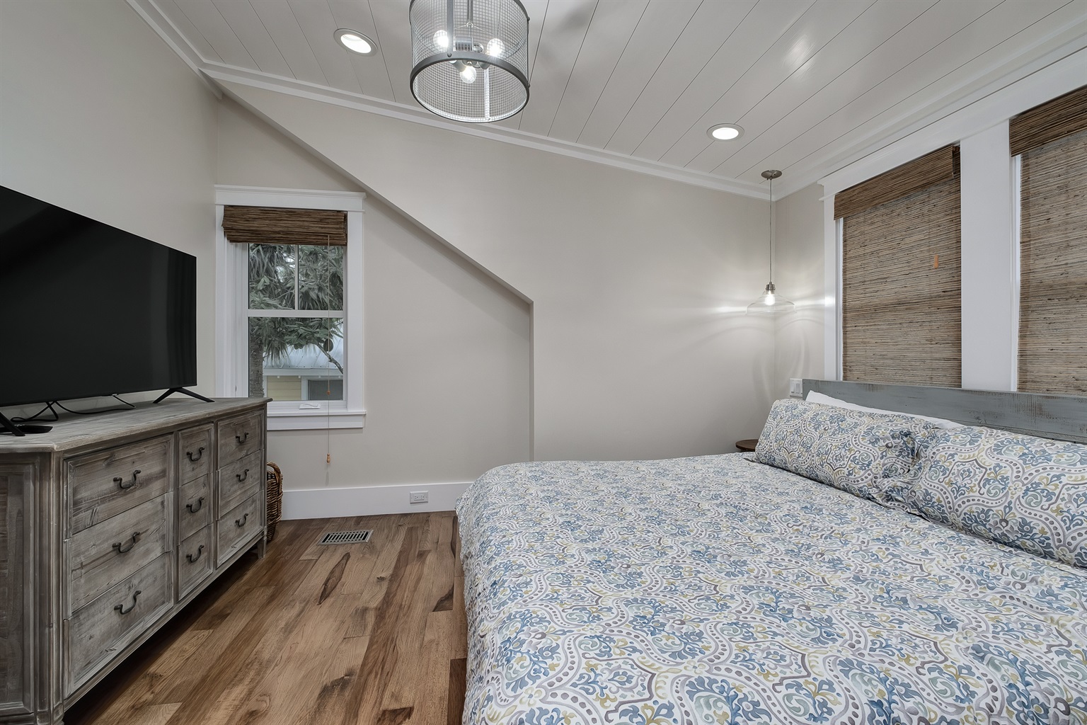 The third bedroom is a queen bed built in with storage below and a closet. This bedroom has a 43" QLED TV.