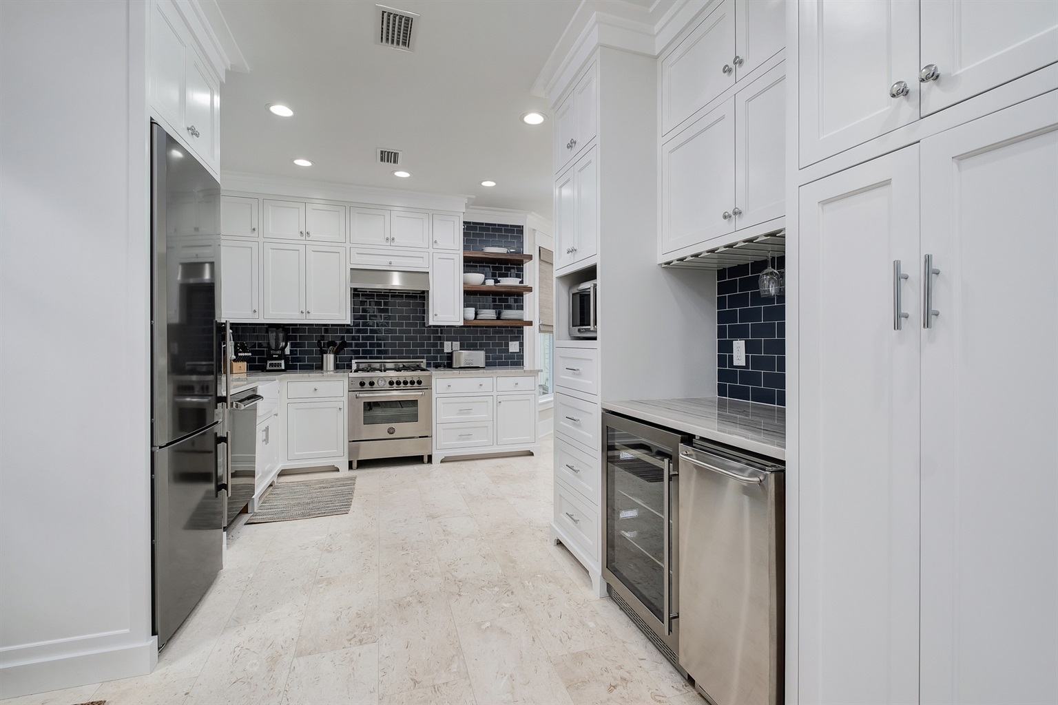 Gas Range with convection oven, Refrigerator/freezer, wine/beverage refrigerator, icemaker, range hood, dishwasher, toaster, blender, crock pot, Keurig coffee maker, complete stock of cookware, utensils, dishware, and items needed for cooking and preparing meals