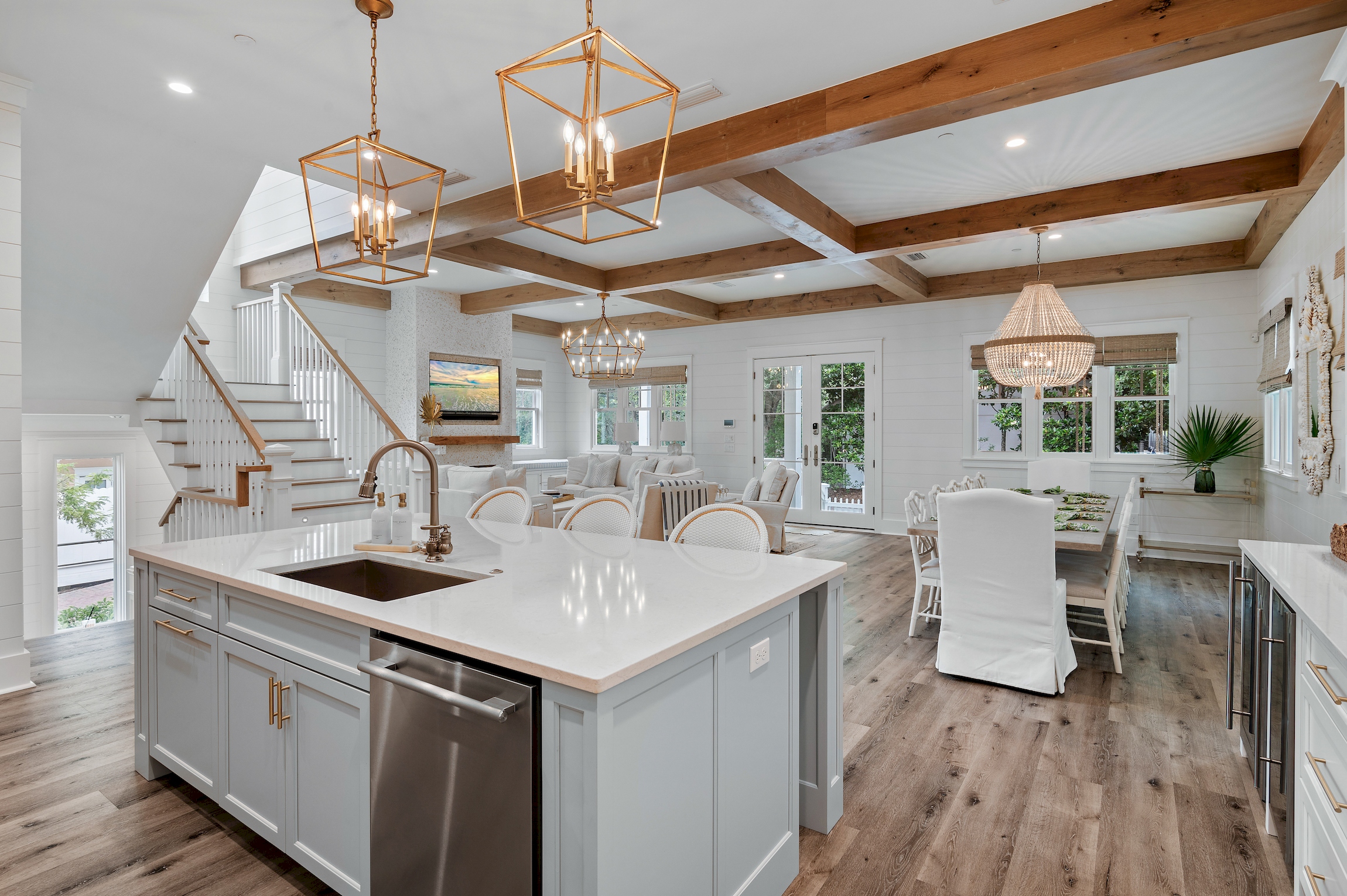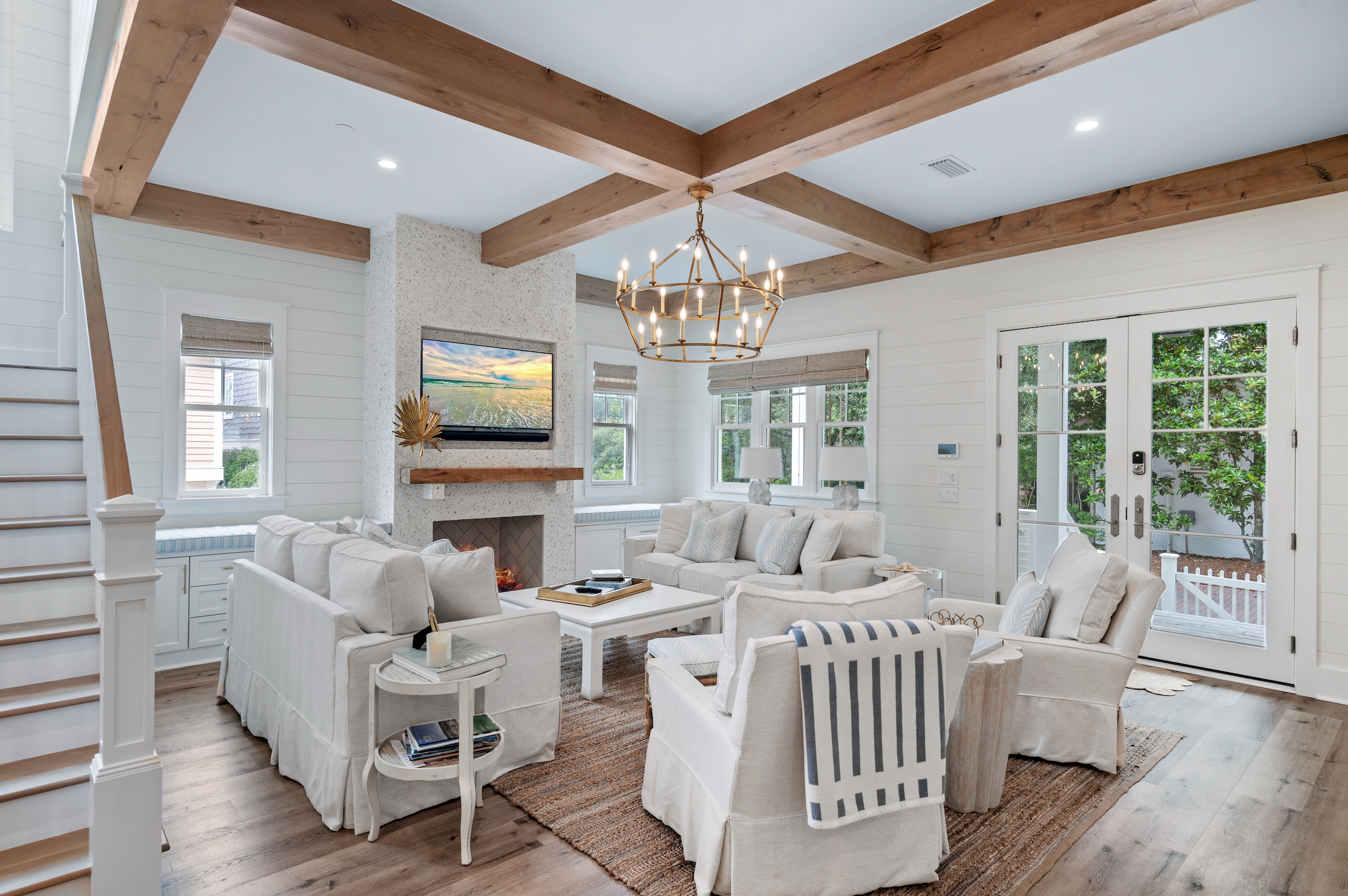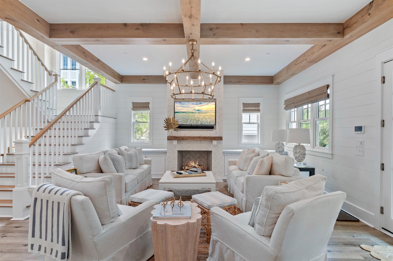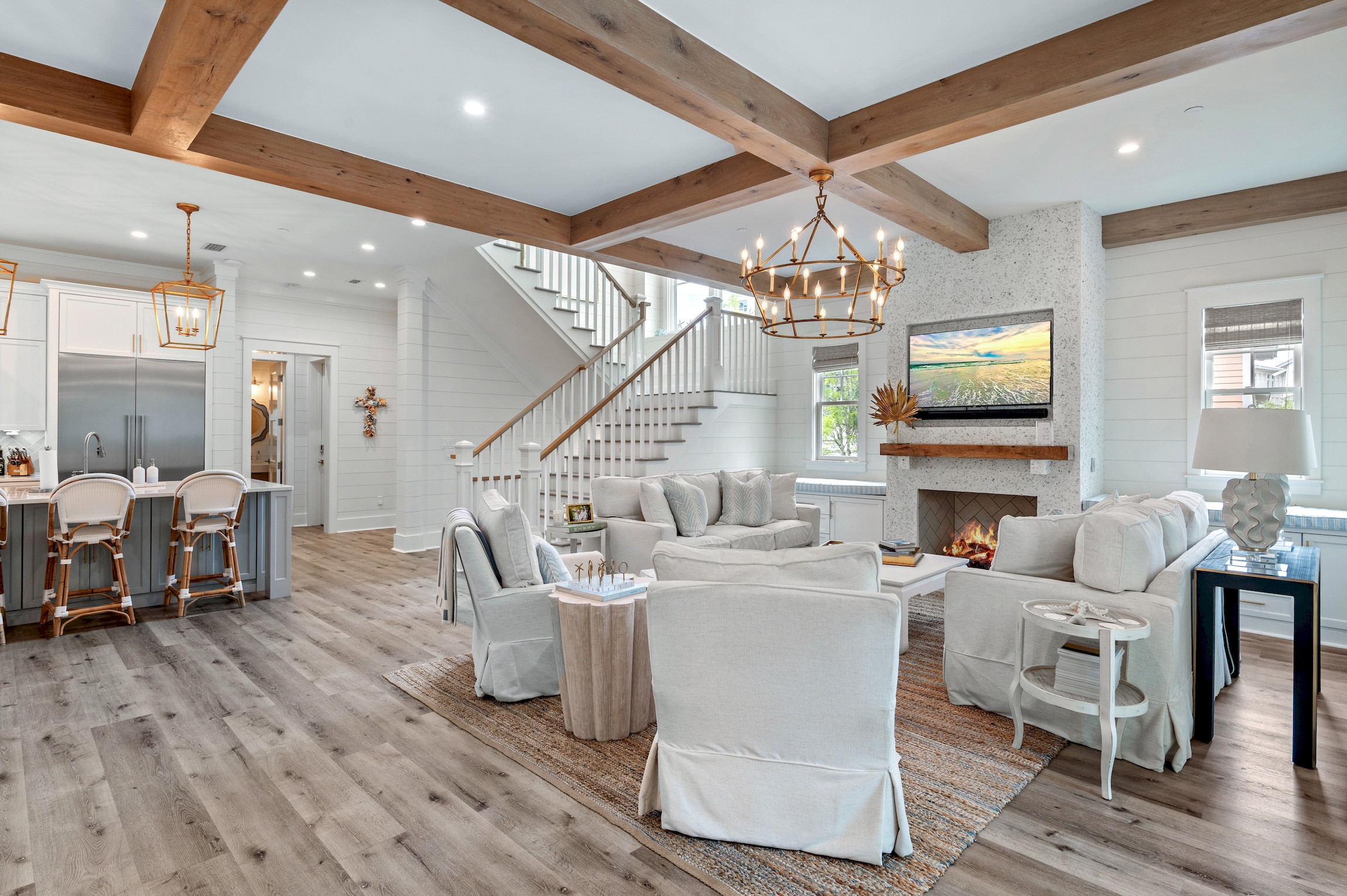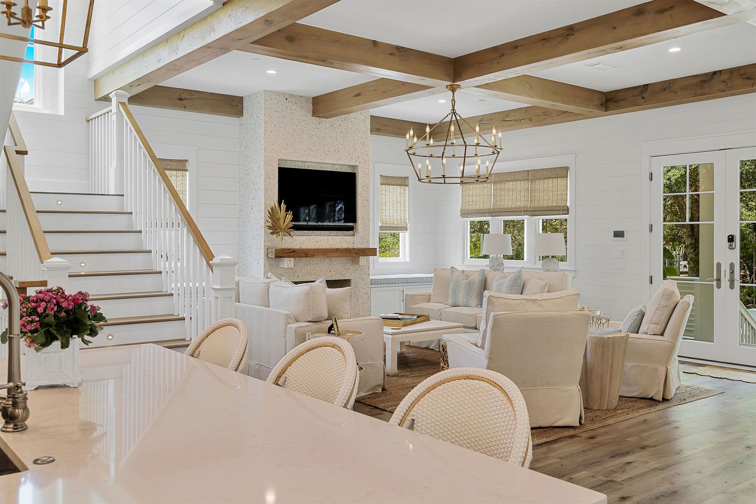 An open and inviting floor plan allows seamless conversation with your guests from the kitchen, dining area, and the living room. Two oversized sofas and two swivel armchairs create a comfortable space to watch your favorite team after a long day at the beach. A beautiful gas fireplace can be lit and enjoyed during the cooler months, and window bench seats on either side boast oversized cushions - the perfect spot to curl up with a book.