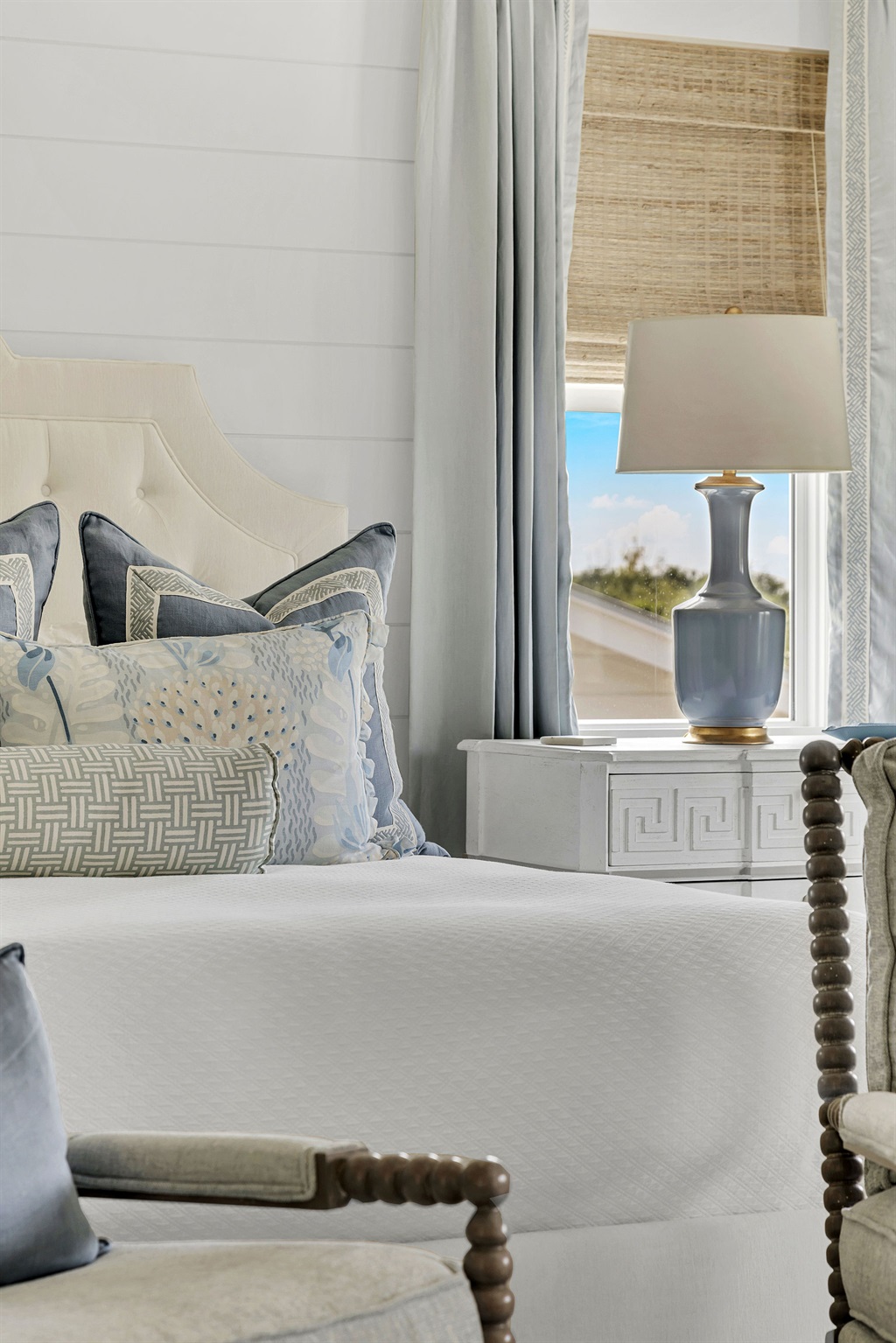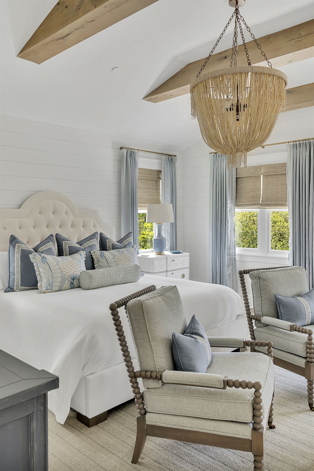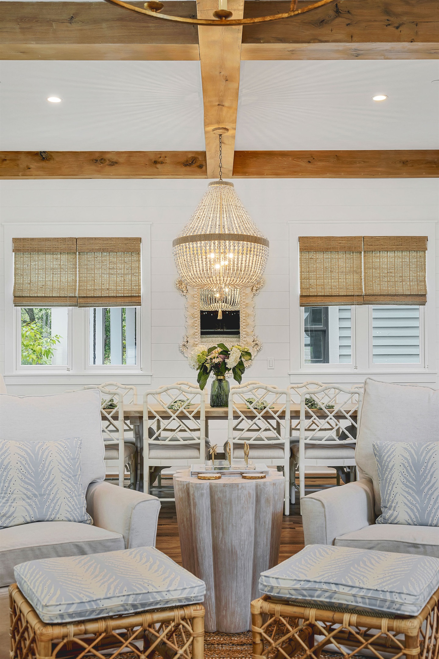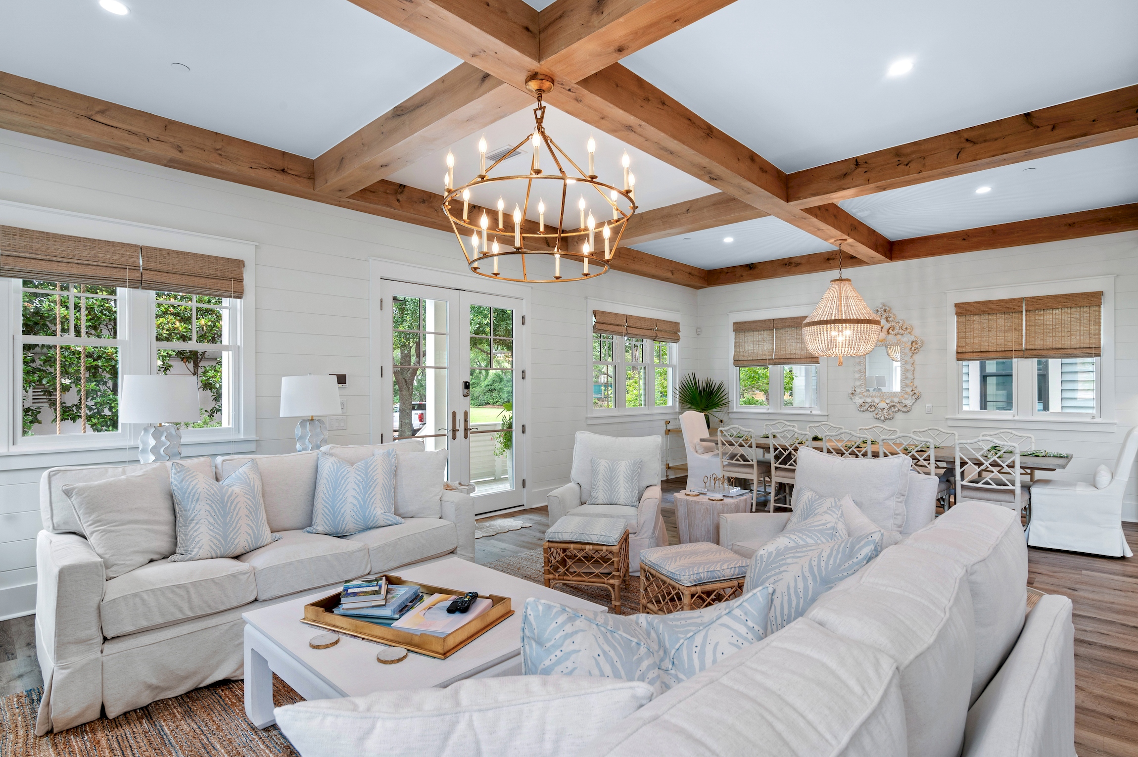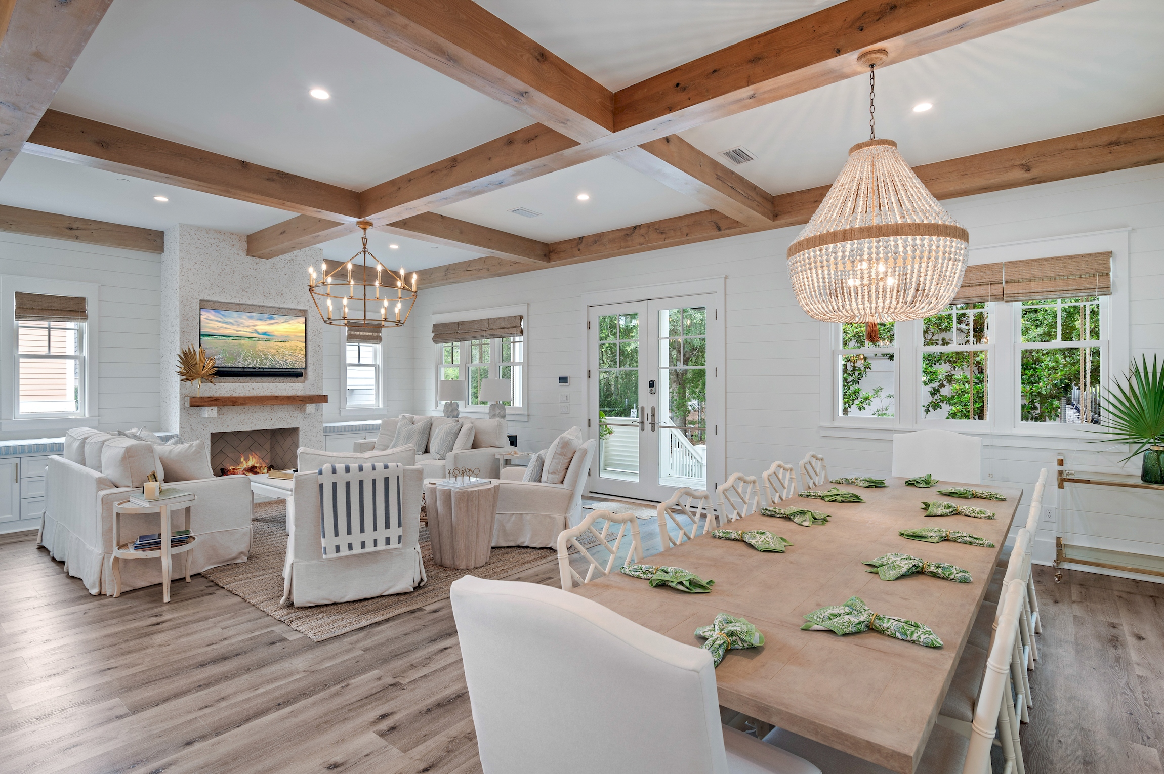 An open and inviting floor plan allows seamless conversation with your guests from the kitchen, dining area, and the living room. Two oversized sofas and two swivel armchairs create a comfortable space to watch your favorite team after a long day at the beach. A beautiful gas fireplace can be lit and enjoyed during the cooler months, and window bench seats on either side boast oversized cushions - the perfect spot to curl up with a book.