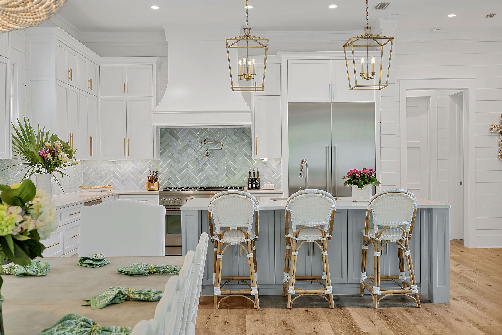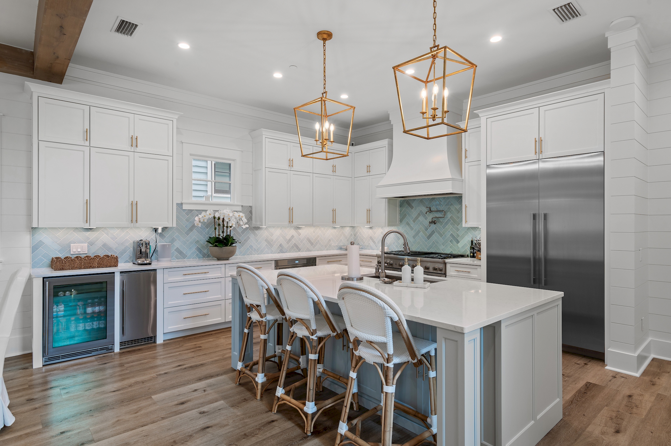 The large front porch looks out to the family pool and offers a partial view of the croquet lawns in Seaside, where you can relax and watch the kids play just across the street. The main floor of the home offers a large dining room and professionally equipped kitchen, featuring high end Thermador appliances, that even the most discerning chef will enjoy. A 48" range offers 6 burners and a griddle. A 24" refrigerator and 24" freezer provide ample space for all of your groceries. Rounding out the kitchen are an under counter beverage fridge as well as a crushed ice maker to enjoy your beverages.