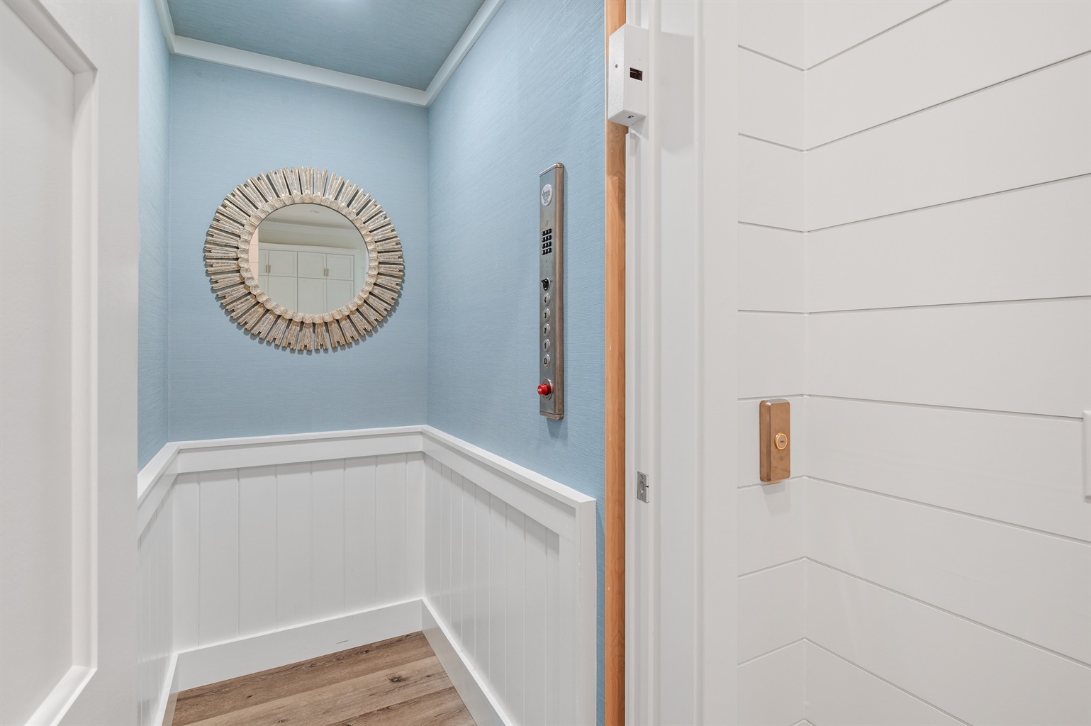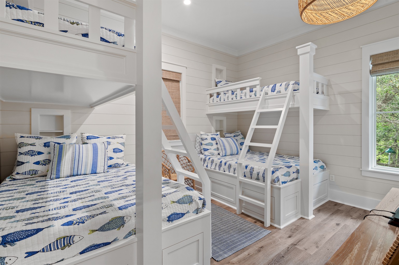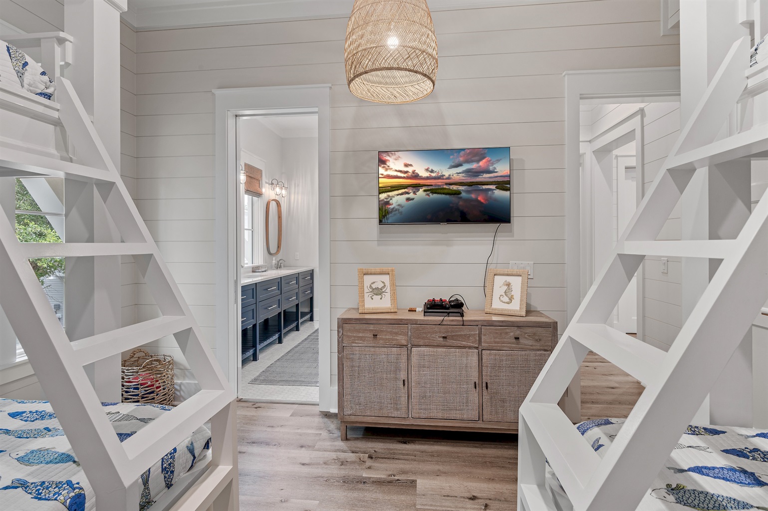 Adjacent to the kitchen you will find a residential elevator that services all three floors and the garage, making a pleasant stay more readily accessible for anyone with mobility issues. Behind the kitchen you will find a powder bath for your and your guests as well as the bunk room, with its large ensuite bathroom. The bunk room features two sets of bunk beds, each with a queen bed on the bottom, and a twin bed on top. The bunk room bathroom ensures everyone has space to spread out and get ready for the day with an oversized double vanity and a lovely tub/shower combination. Additionally, you will find a PlayStation and wall mounted TV for the kids have a little fun indoors after the sun sets.