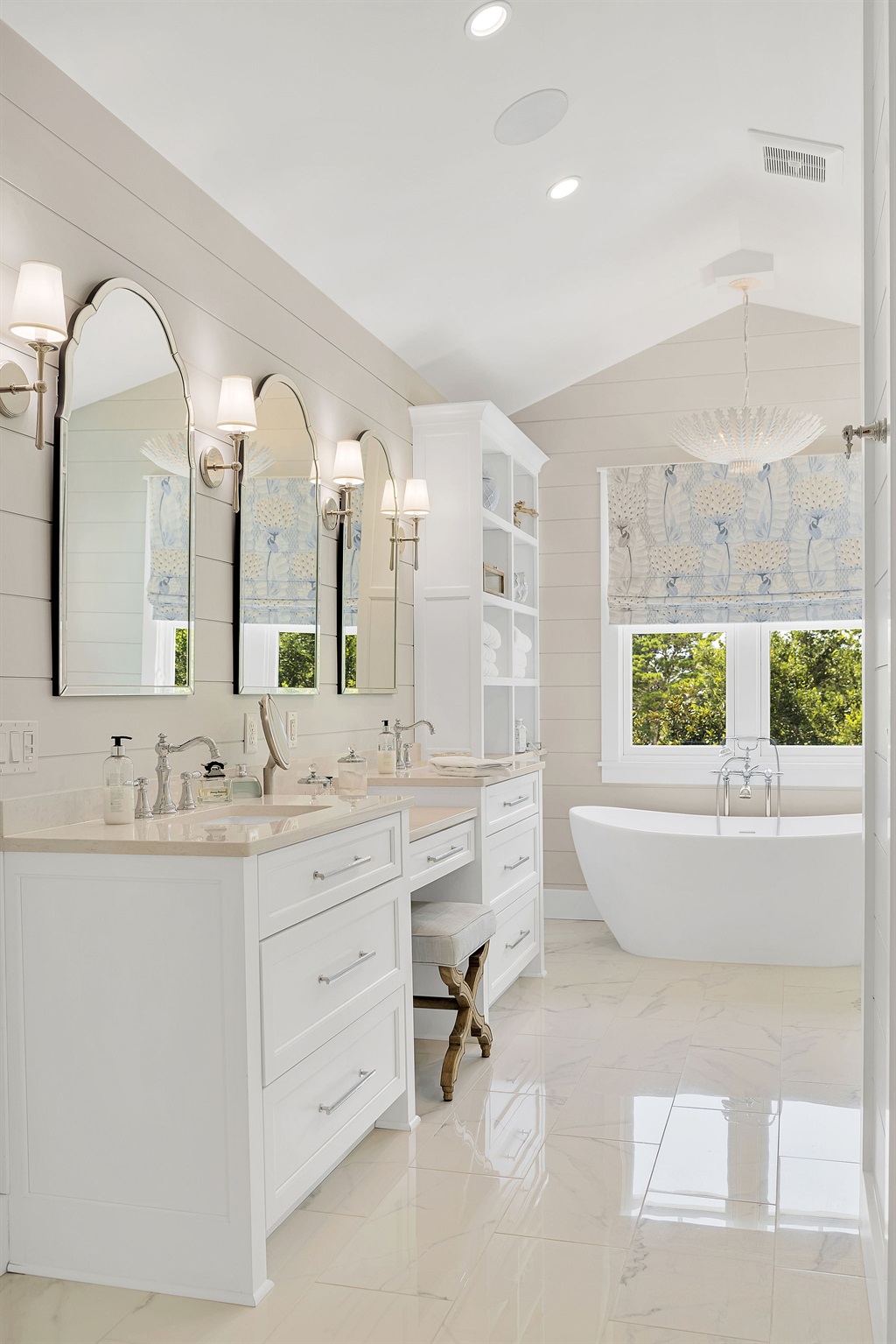 Upstairs on the second floor you will find 3 bedrooms. At the front of the house lies two large bedrooms, which open up to a large front porch. At the rear of the second floor lies the laundry room and a third oversized junior suite. One of the front bedrooms features a beautiful king bed, large closet, and an ensuite bath with walk in shower and a bench seat. The other front bedroom features two beautifully upholstered queen beds, a large dresser, spacious closet, and ensuite bath. The bedroom at the rear of the second floor features a large, light filled bedroom with a king sized bed and dresser, as well as a large walk in closet and bathroom with a walk in shower. Rounding out the second floor is the thoughtfully designed laundry room, with a front loading washer and dryer, hanging space to dry your clothes, and ample counter space for folding and sorting. The elevator services this floor as well.