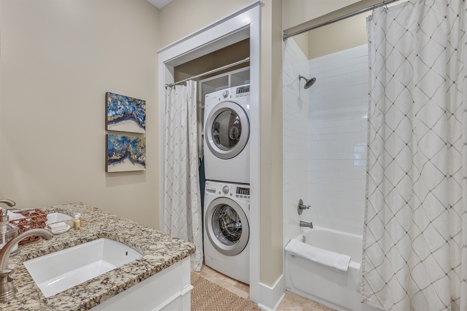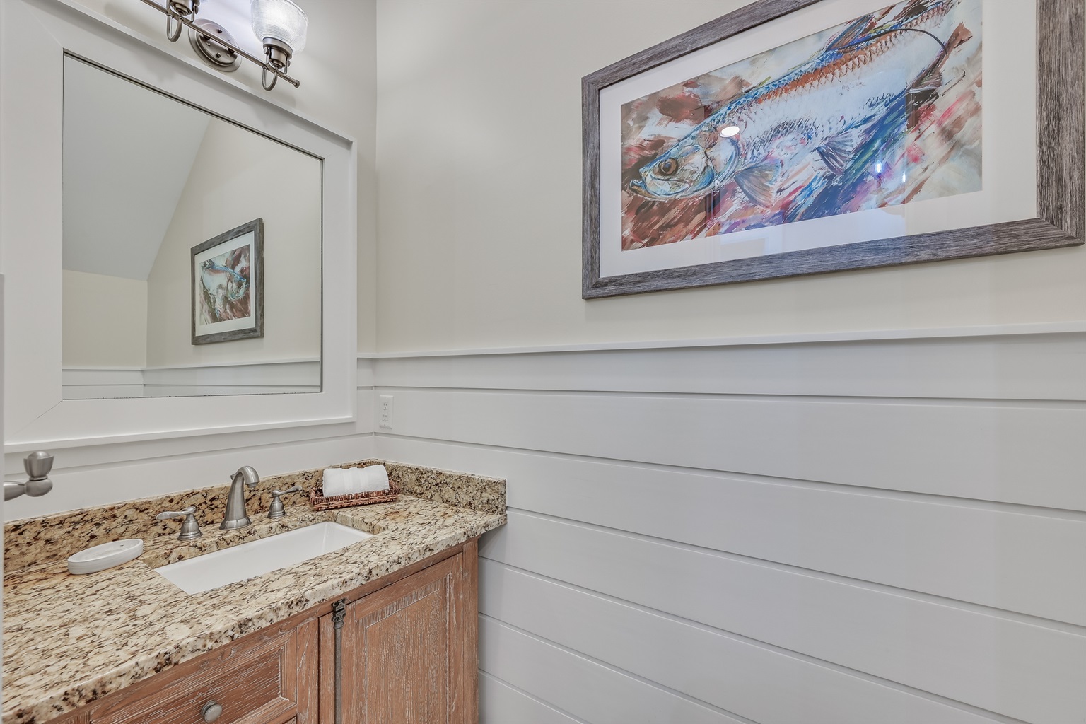 The first floor offers a lockable mother-in law suite, complete with a full kitchen, living room, bathroom with double vanity, washer and dryer, and a large bedroom with a king size bed. There is also a half bath on the first floor, which offers easy access when enjoying the pool. You can also access the 2 car garage here, where you can park your vehicles in the shade or stow away all of your wagons and strollers for the week.