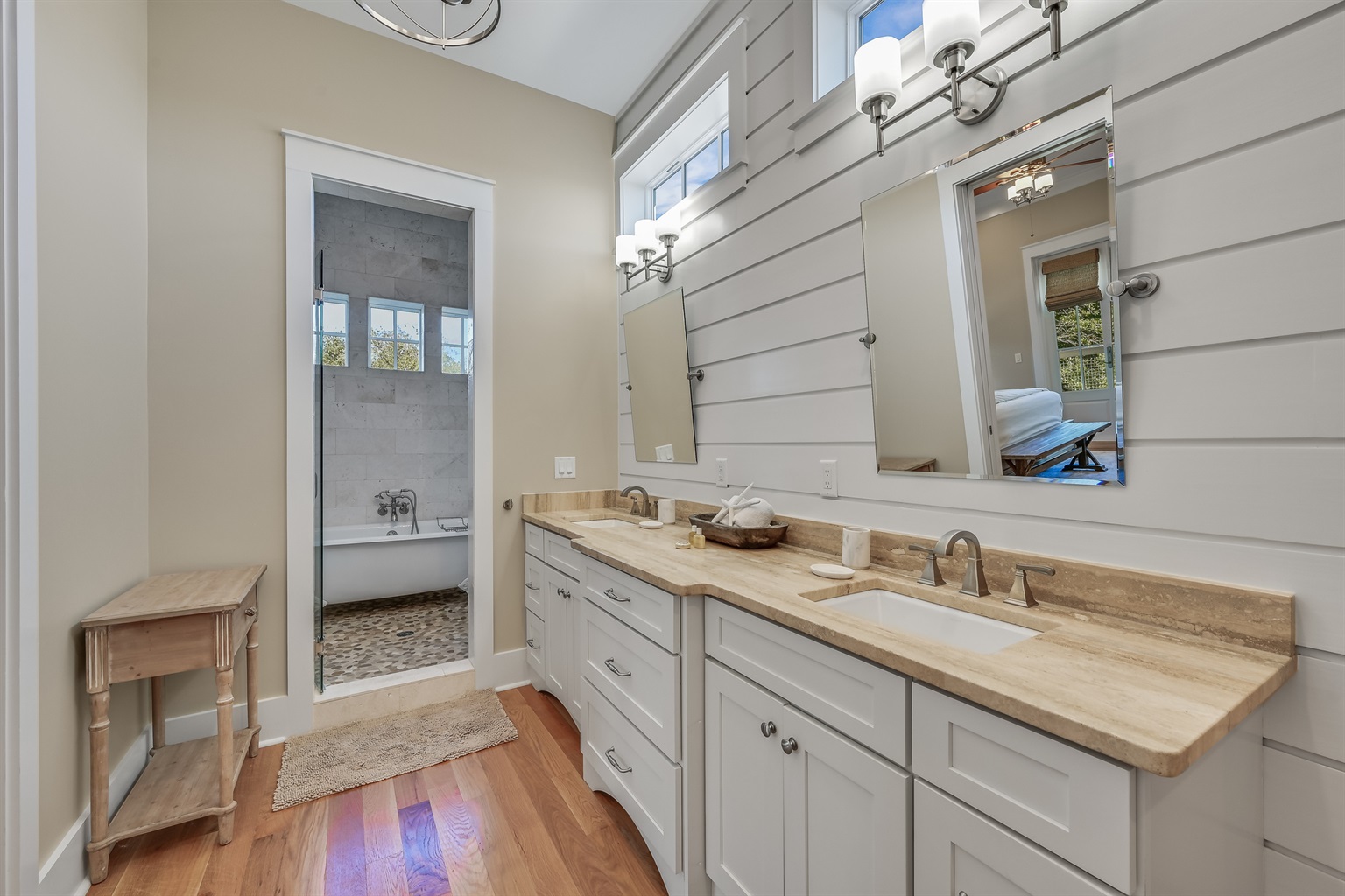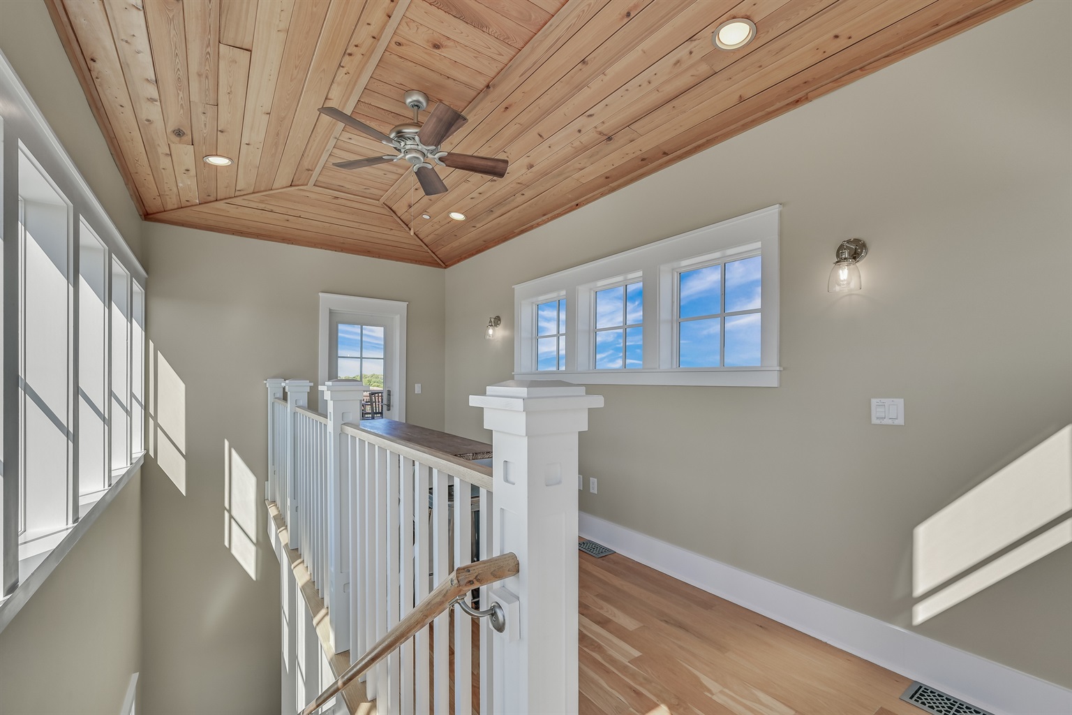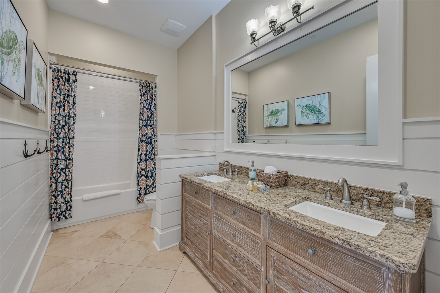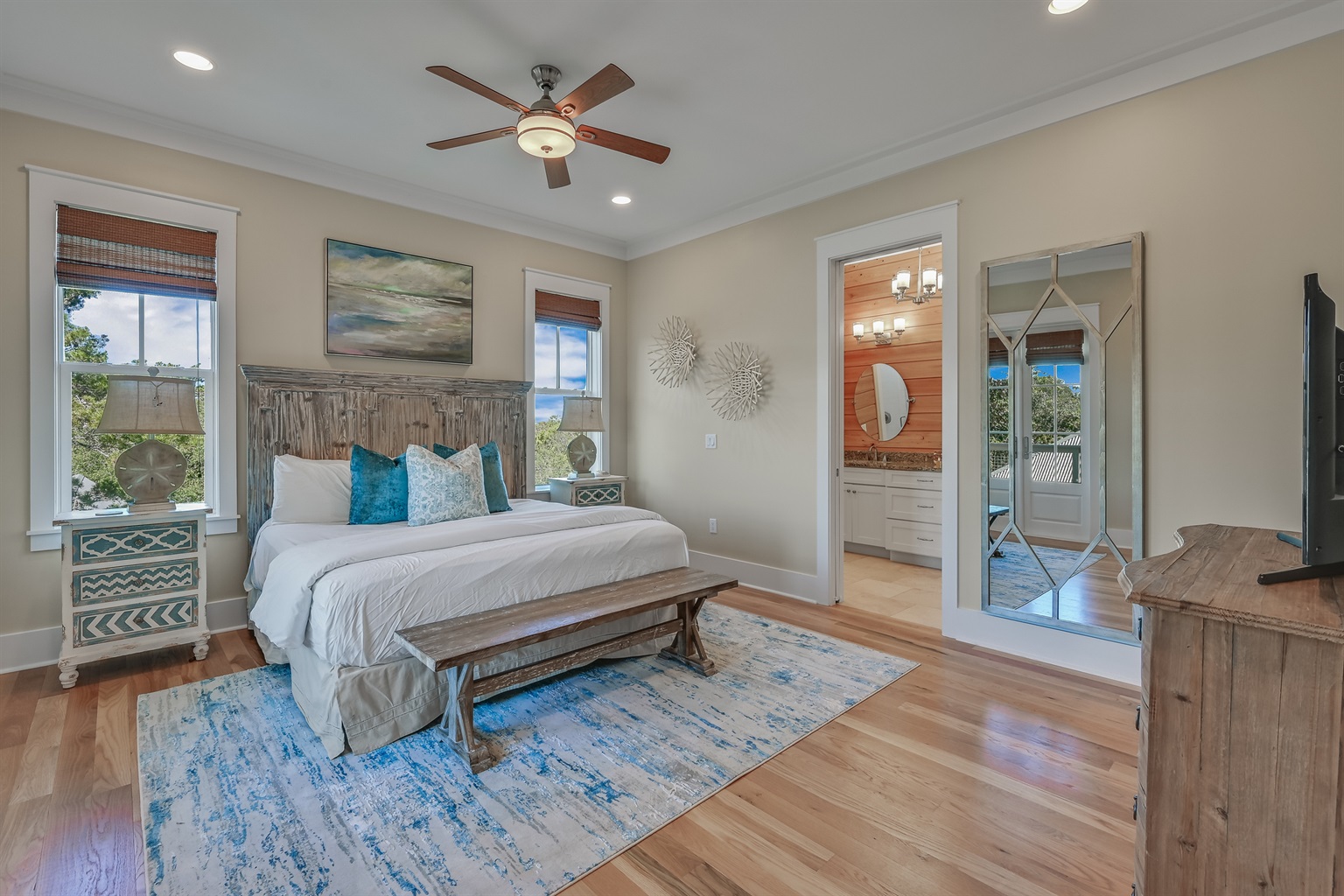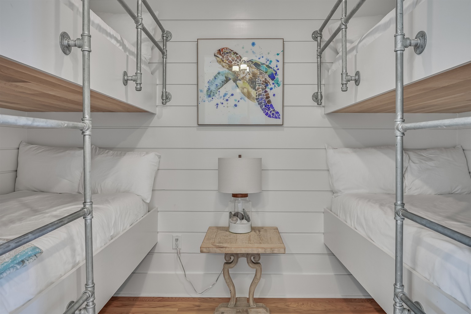 The third floor offers a third living room with a plush slipcovered sofa and two arm chairs. You will also find the second primary suite, identical in size to the second-floor suite, a 4th bedroom, and the bunk room, as well as two porches. The secondary suite offers another oversized bedroom with king size bed and a large walk-in closet and bathroom with dual vanities and a large walk in shower. The 4th bedroom is a little smaller but still offers a nice sized walk-in closet and a king size bed. This bedroom shares a hall bath with the bunk room, complete with a tub/shower combo; so the little kids still have access to a bath tub. The bunk room offers 4 XL twin beds and a sliding barn door for darkness and privacy. There is also another nice sized table and chairs here, perfect for game nights for the kids.