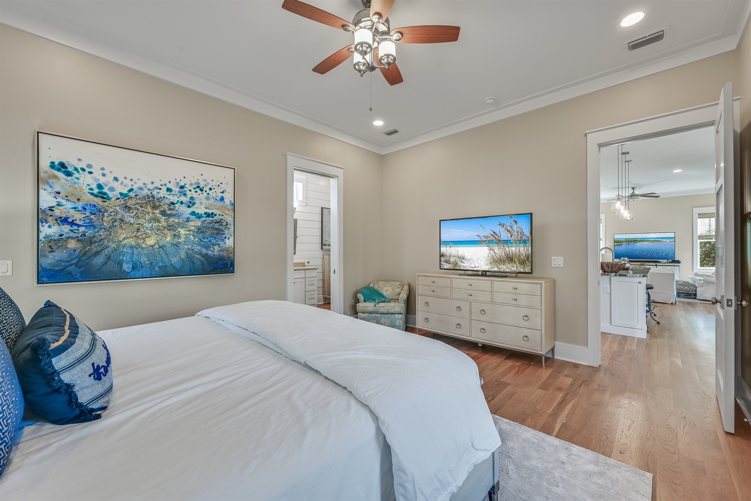 The second floor offers a large open living space with a large sectional, additional side chairs, a large dining table and pantry, the main kitchen, laundry room, ice maker, primary suite, and a half bath. The chef’s kitchen offers a 48” range, featuring double ovens, 6 burners, and a griddle for morning pancakes. A 48” refrigerator and freezer provide ample space to stow away all of your groceries for your entire group. The kitchen offers everything you could possibly need: pitchers, cookware, blender, serving plates and bowls, coffee pot and Keurig, cake pans, baking sheets, and more. Enjoy dinner around the large dining table, or you can dine al fresco on the dining porch. The laundry room overs a full size washer and dryer as well as a Hoshizaki ice maker. The attached primary suite offers an oversized bedroom with a king size bed, access to a porch overlooking the pool, and a large bathroom with a soaking tub and shower, and a huge walk-in closet.